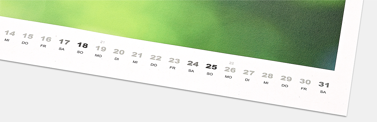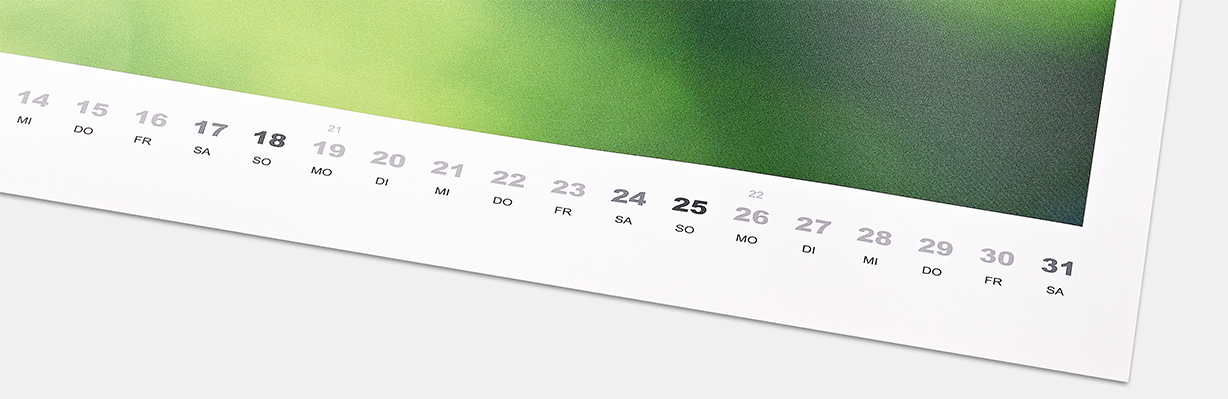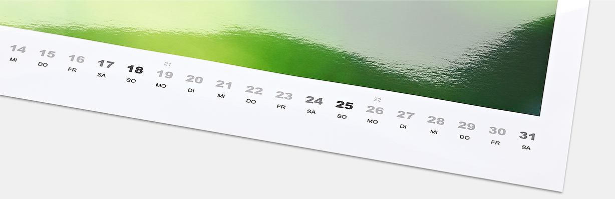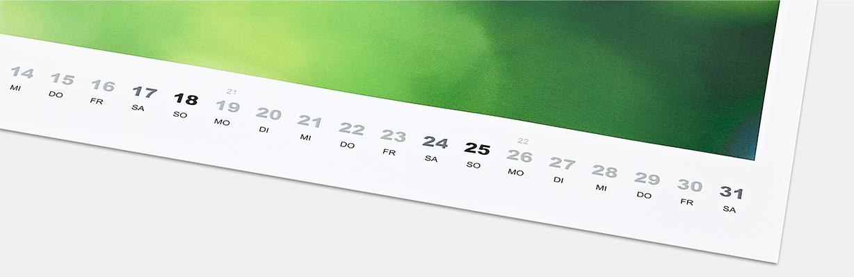 Unser Fotokalender wird aus echtem Fotopapier gefertigt und besticht durch prachtvolle, natürliche Farben. Er erzeugt atemberaubende Effekte durch die Lichtreflexionen auf der hochglänzenden Oberfläche. Unser Verfahren bringt selbst feinste Bilddetails klar zur Geltung. Dabei setzen wir auf Papier aus nachhaltiger Forstwirtschaft.